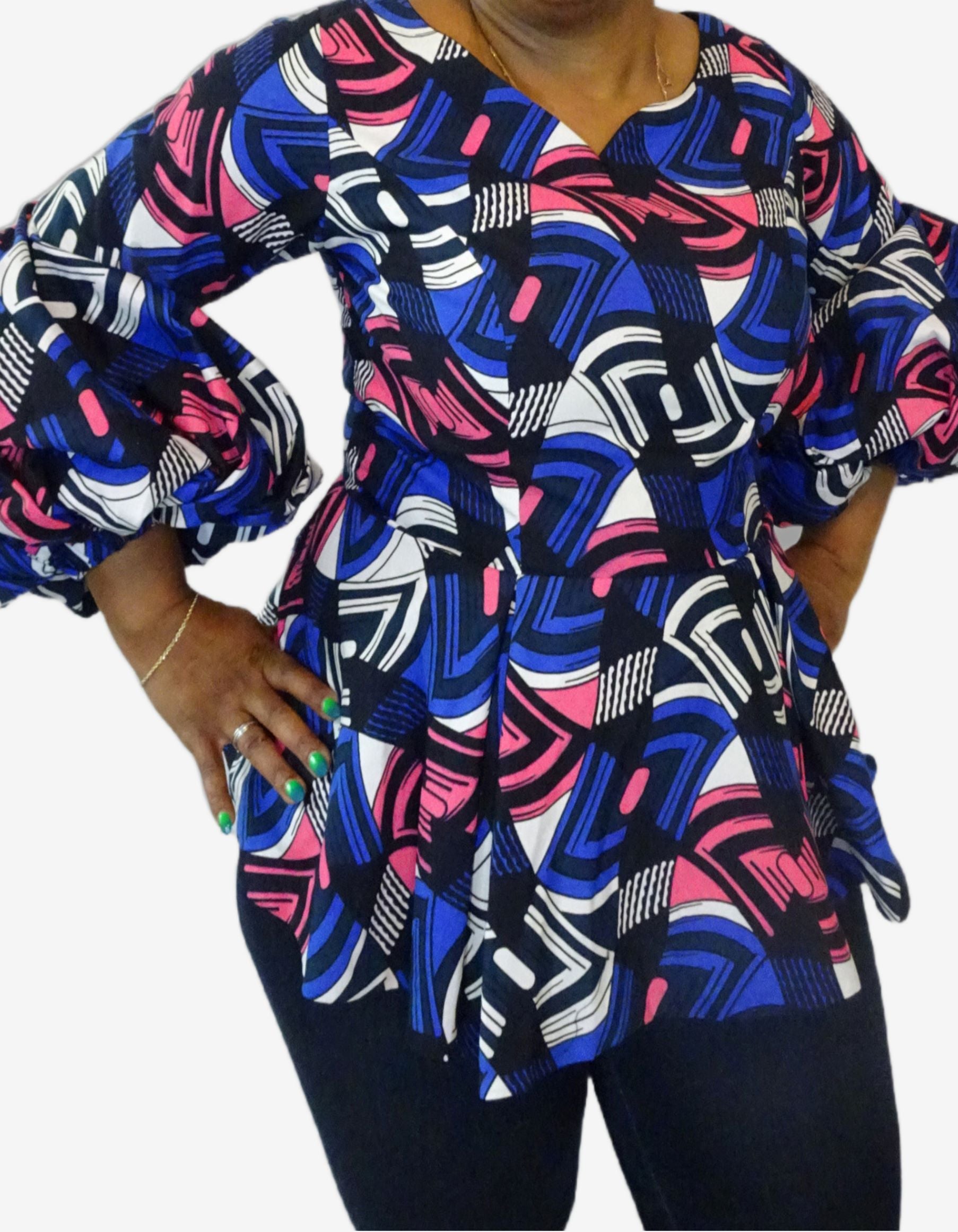 This colorful top is a showstopper with puff sleeves and flare waist. Beautifully made and perfect for any occasion. It can be worn with a pair of slack and heels or a pair of jeans and heels.