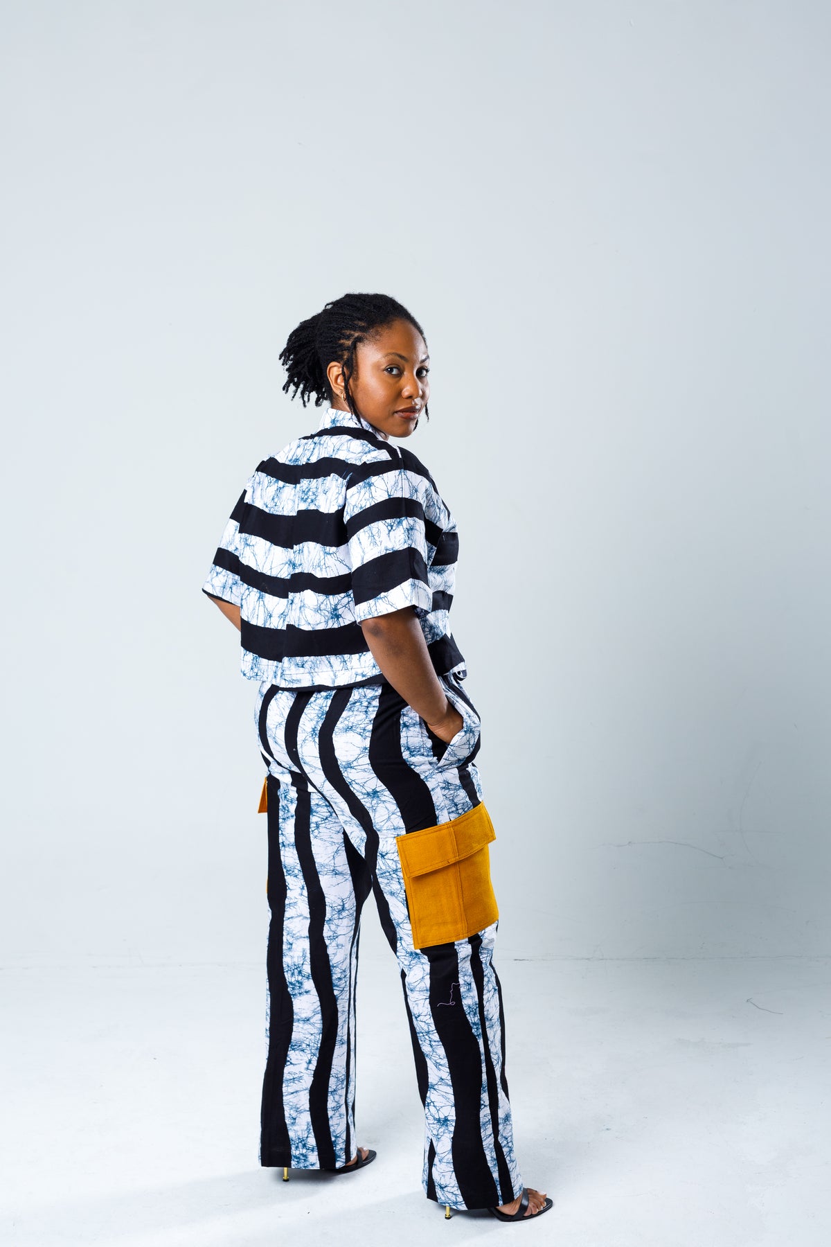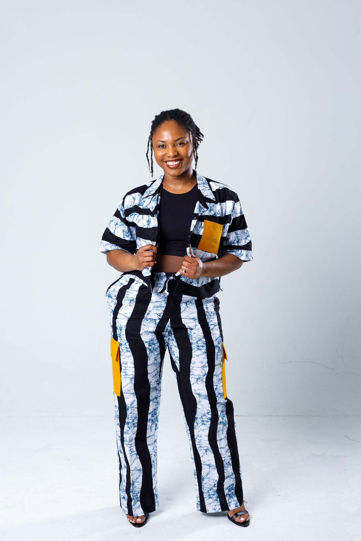 Make a statement with this striking two‑piece set featuring a bold mix of wavy black‑and‑white stripes, blue marbled detailing, and vibrant colored pocket accents. This coordinated outfit blends art‑inspired design with everyday comfort, giving you a look that’s effortlessly stylish and impossible to ignore.